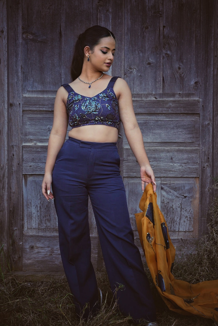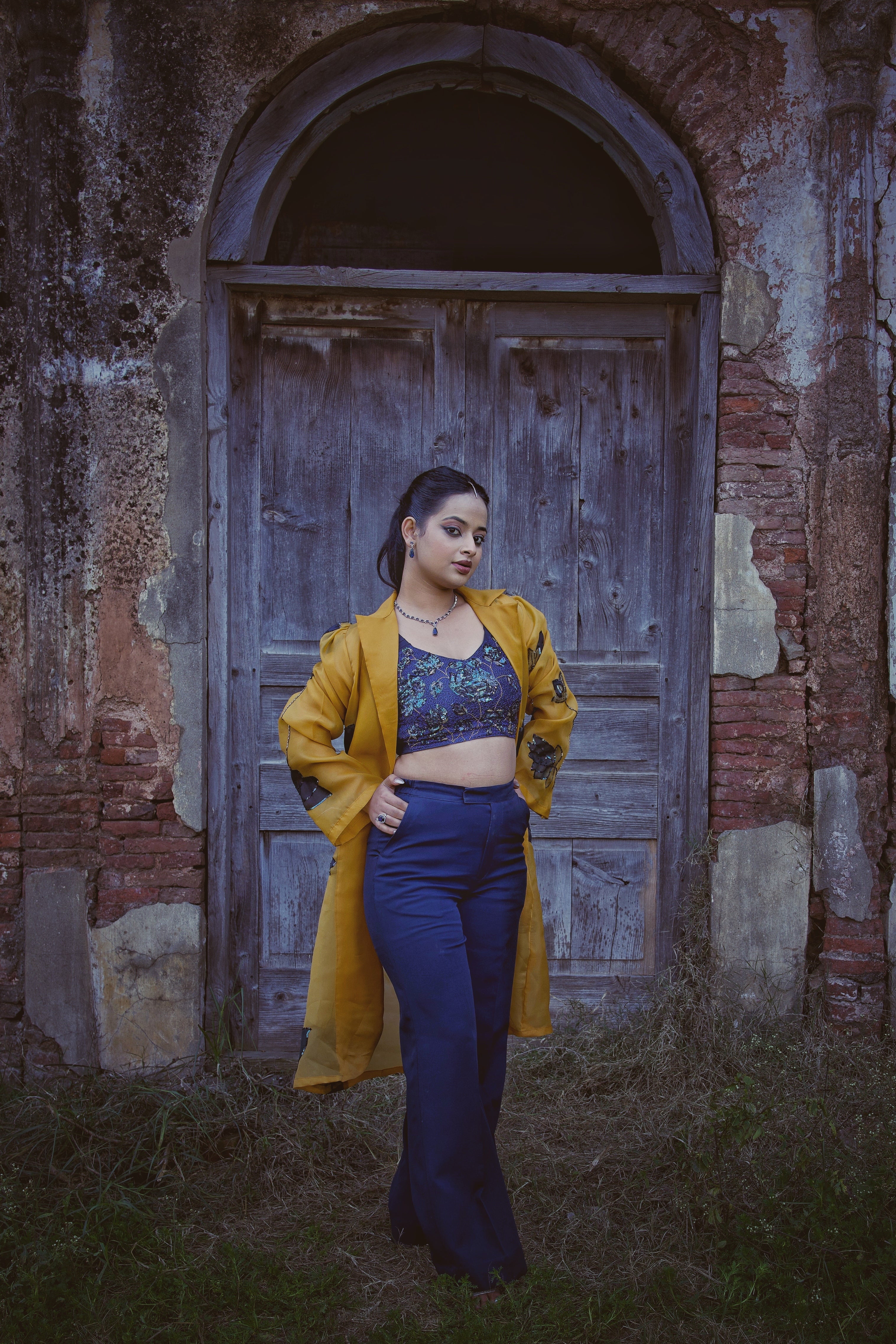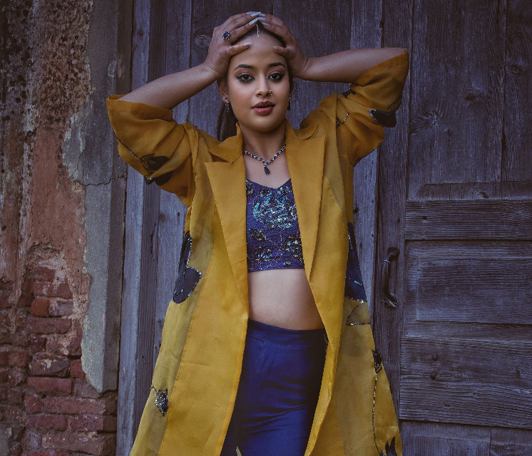 • Color: Mustard yellow (overcoat) with deep navy (bralette and pants)