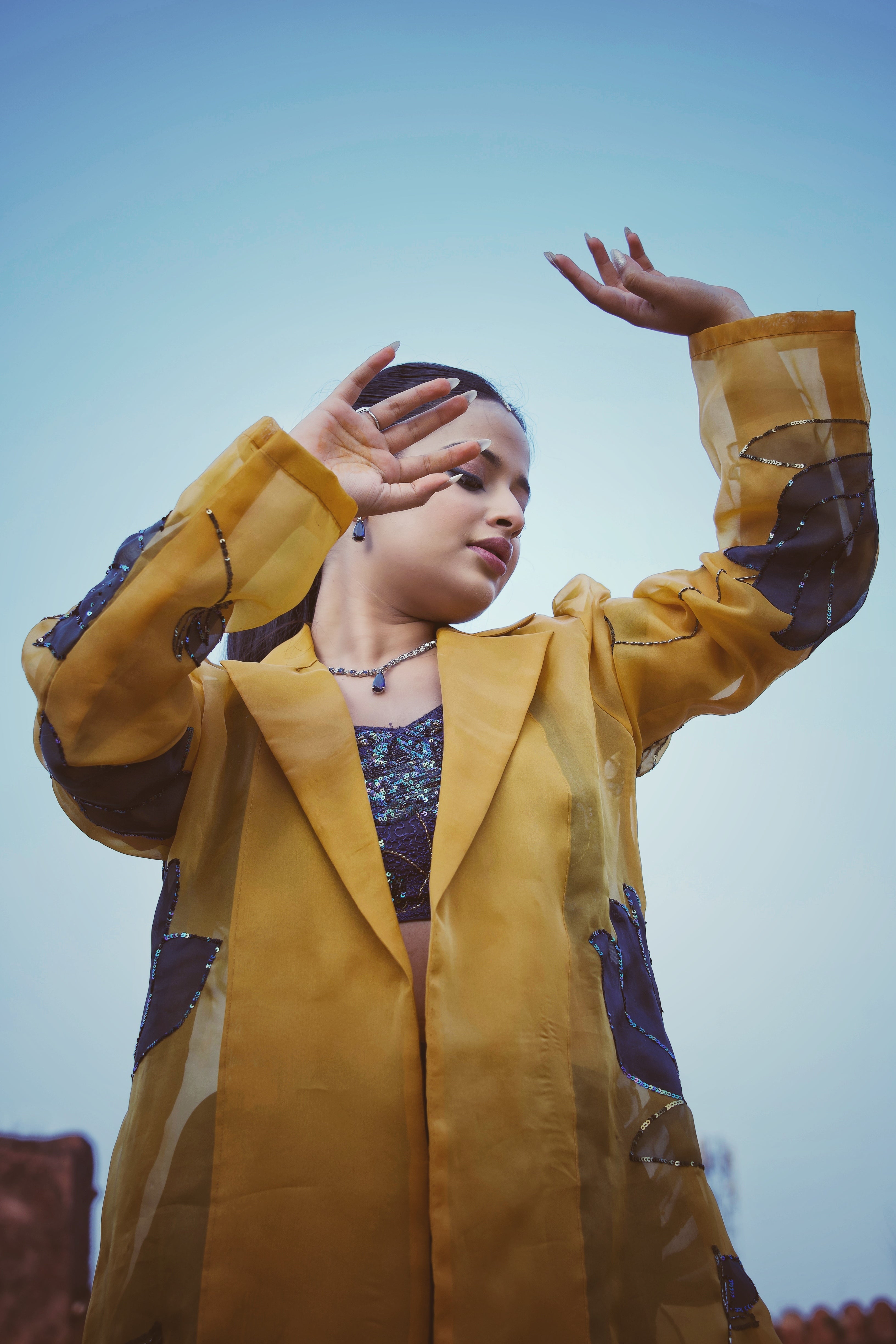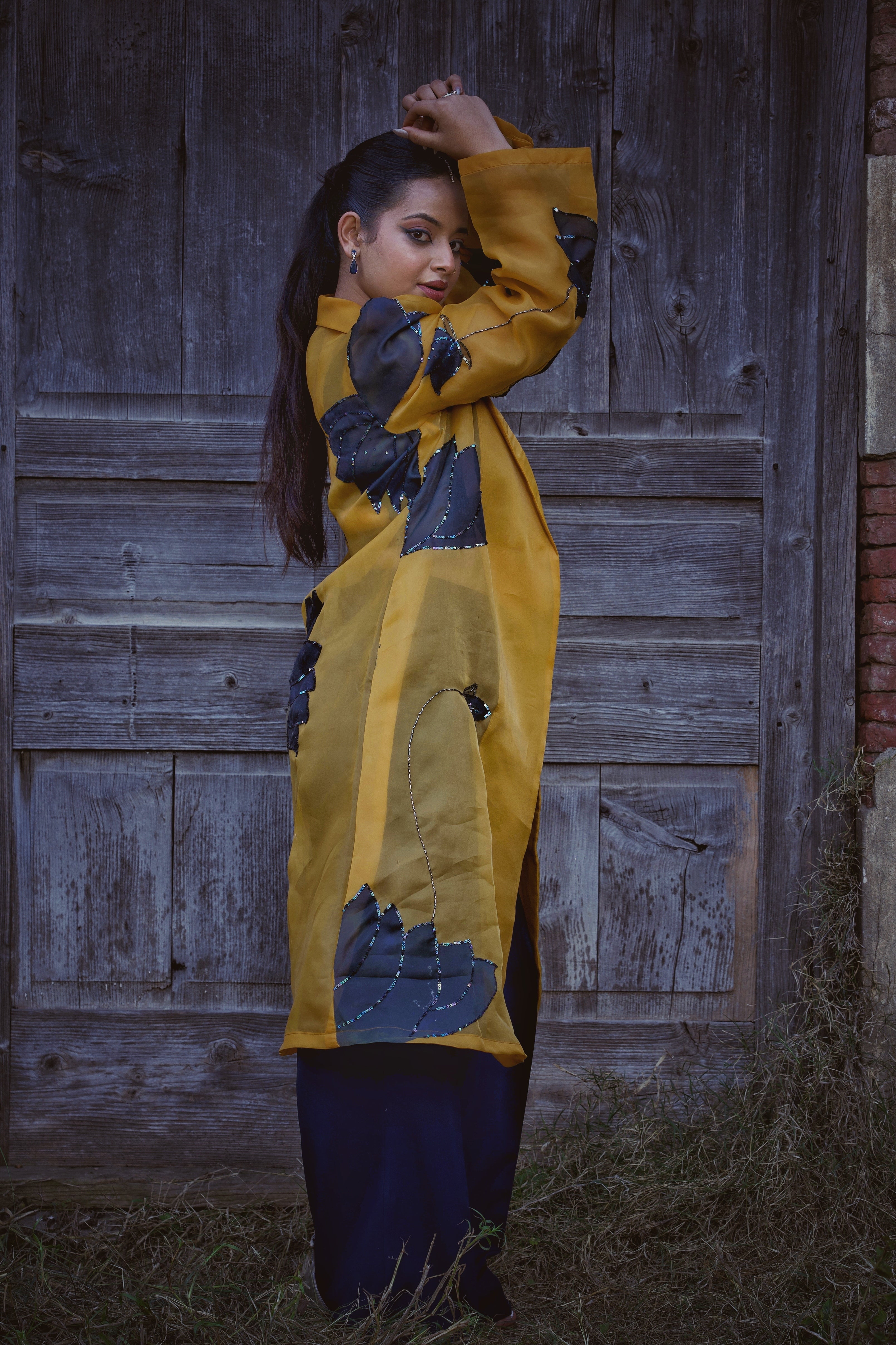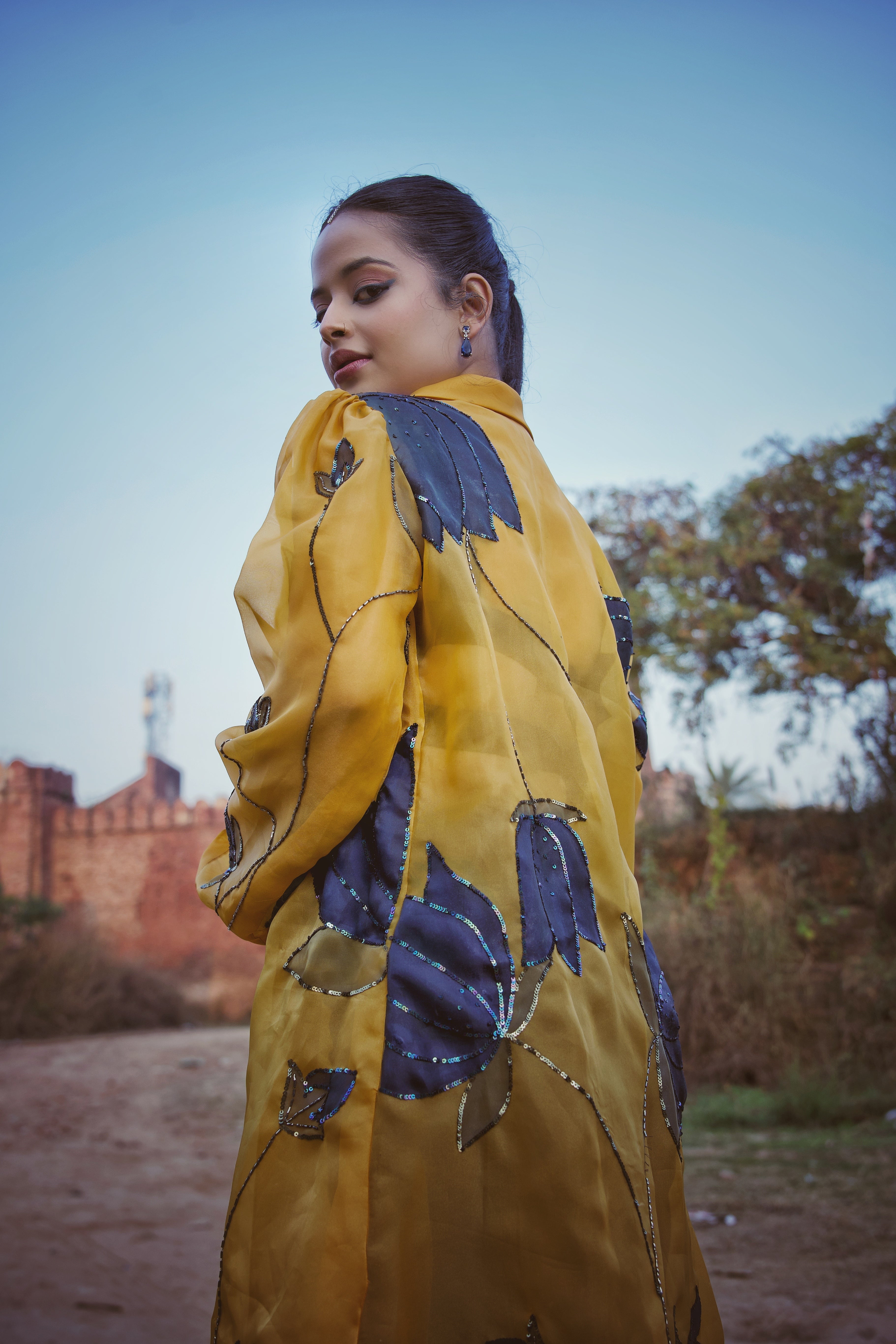 • Design: Sheer mustard overcoat adorned with navy lotus floral appliqué and sequin embellishments