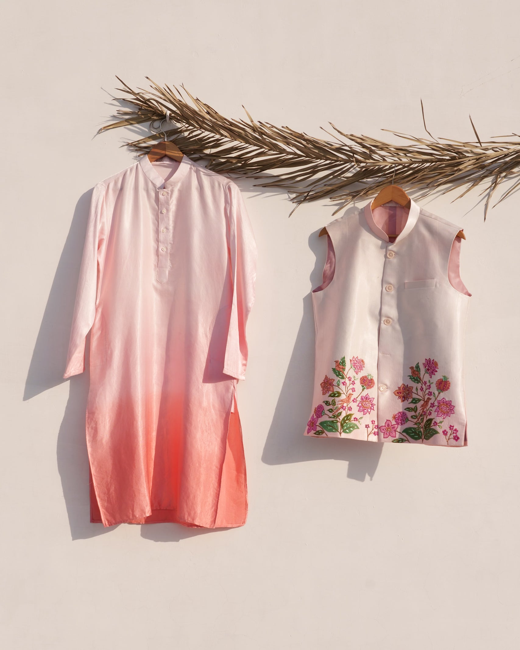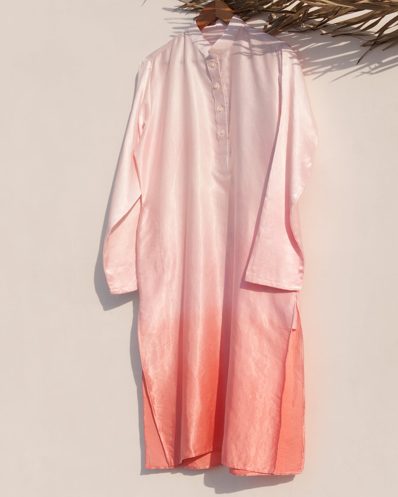 Tailored in luxurious Gaji Silk, this ombré coral pink kurta offers a relaxed yet polished silhouette.