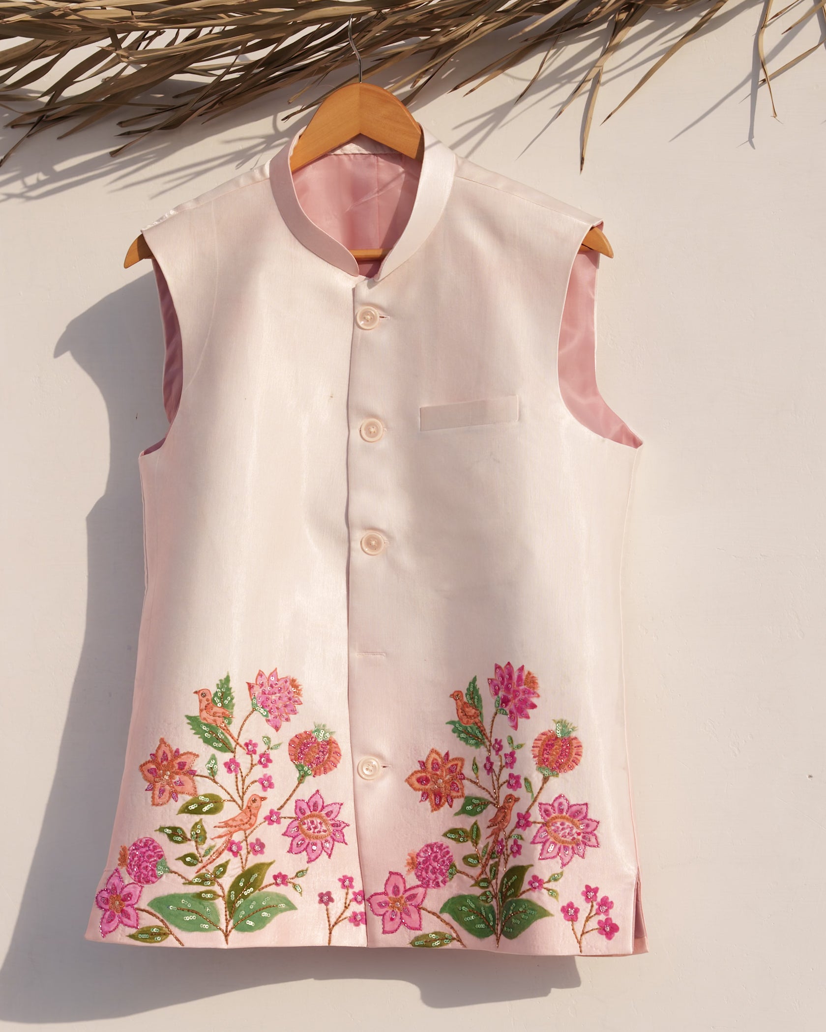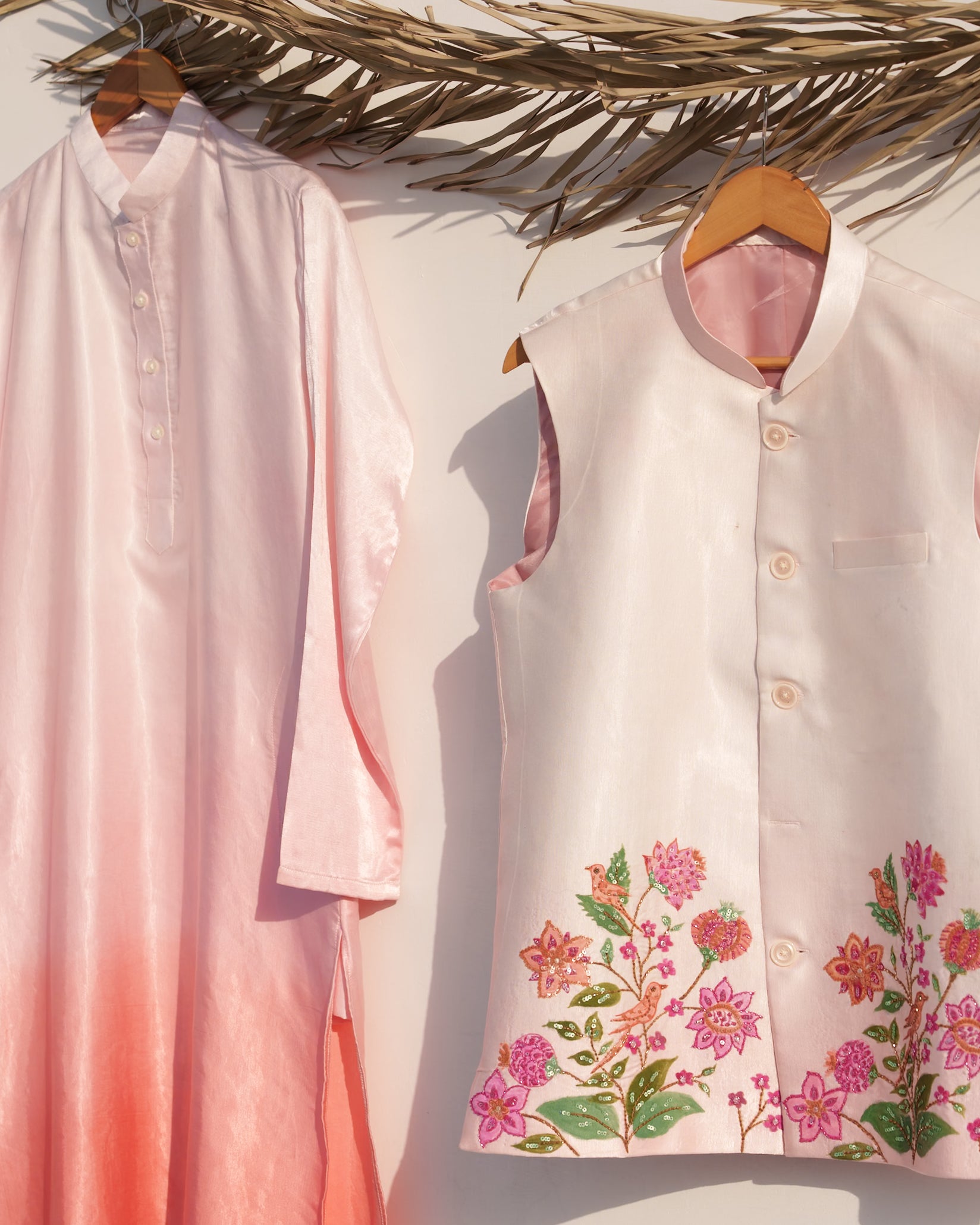 A modern heirloom for the discerning gentleman, Ornate Prince celebrates artisanal elegance with regal textures and refined detailing. Designed in a sophisticated ombré coral pink, this coordinated set brings together timeless tradition and contemporary charm.