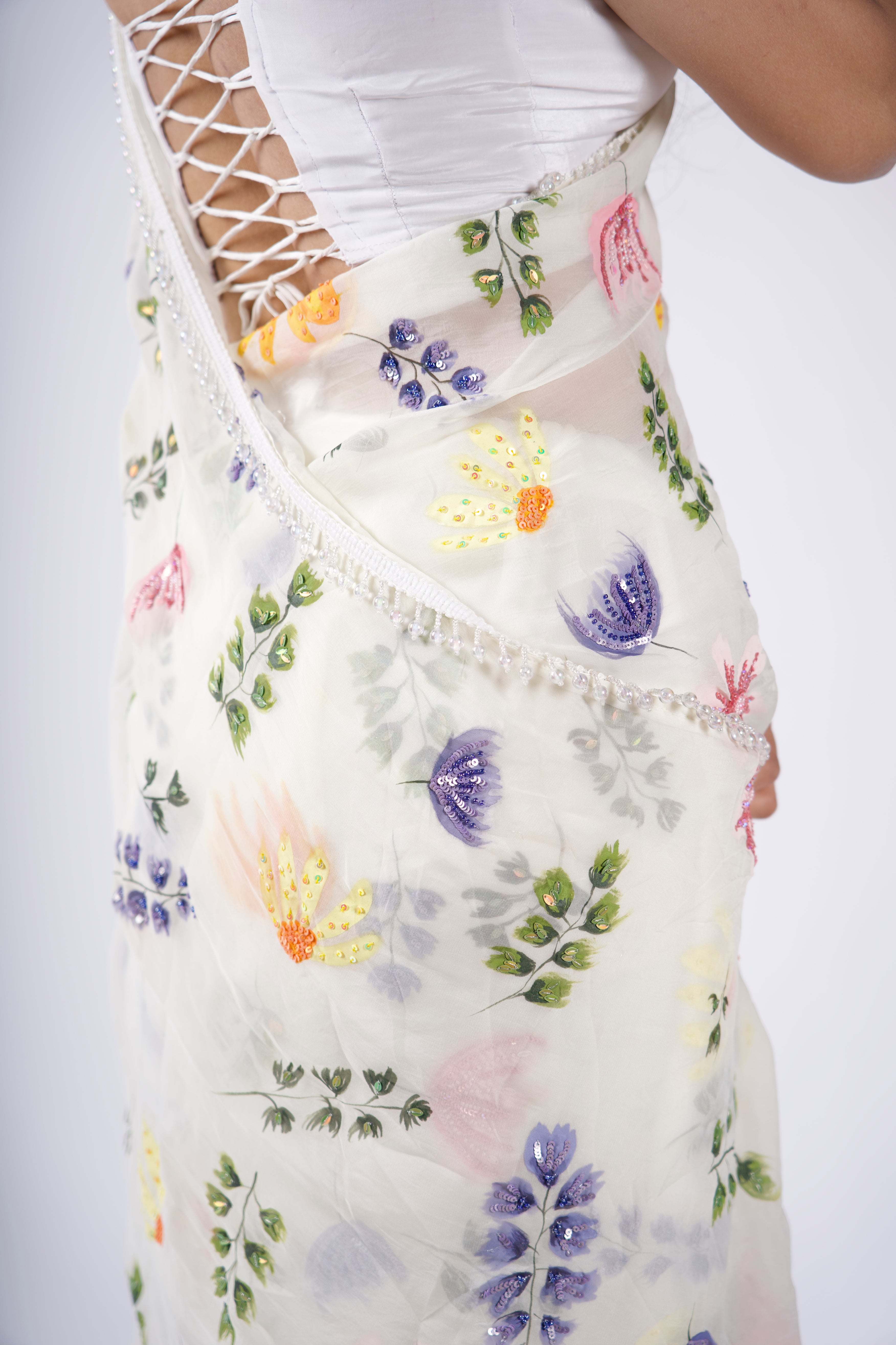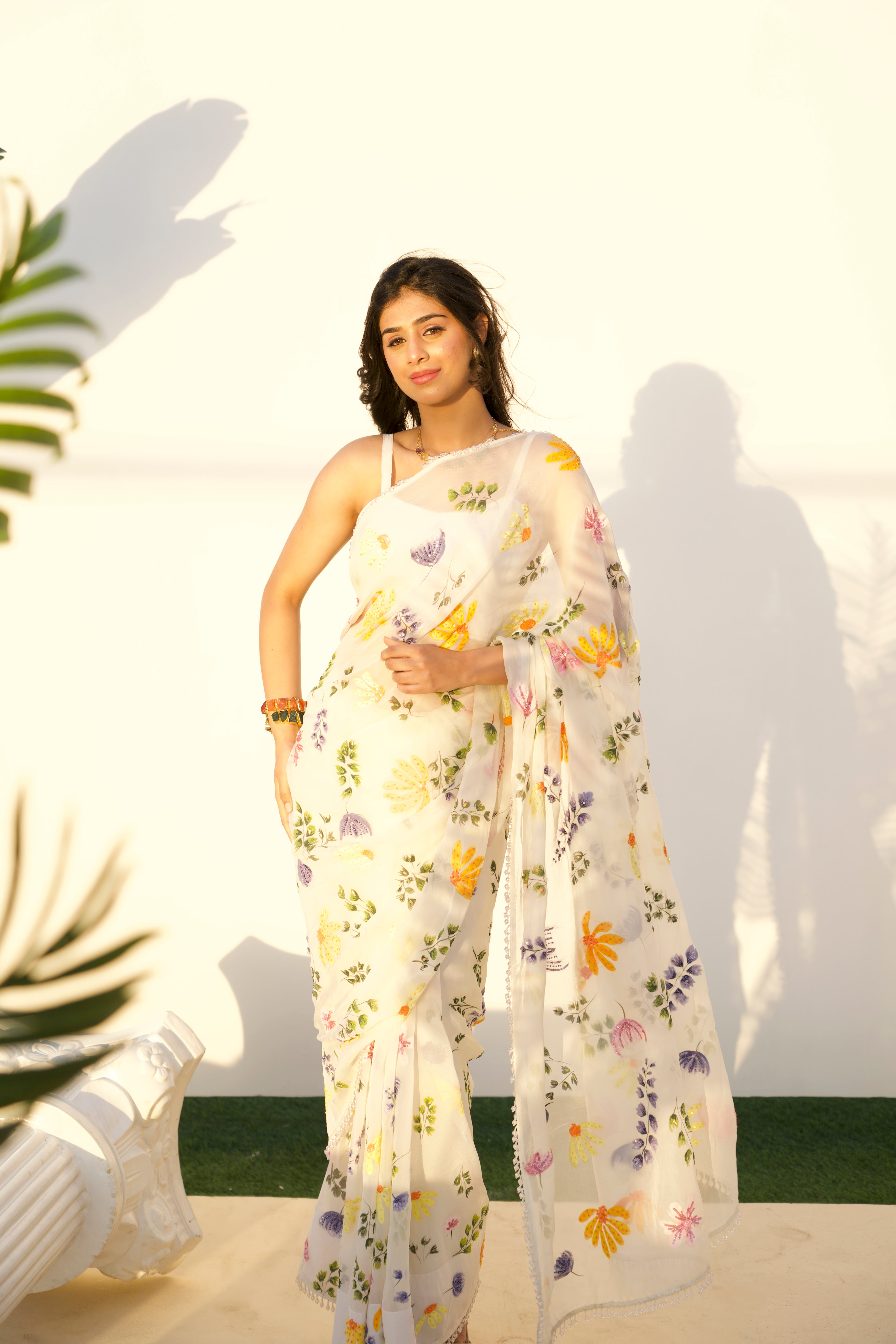 Indulge in the soft elegance of Pastel Haze, a hand-painted organza saree that captures the beauty of blooming magnolias and serene skies. This piece is more than attire — it’s a canvas of calm, crafted by hand, and worn with meaning.