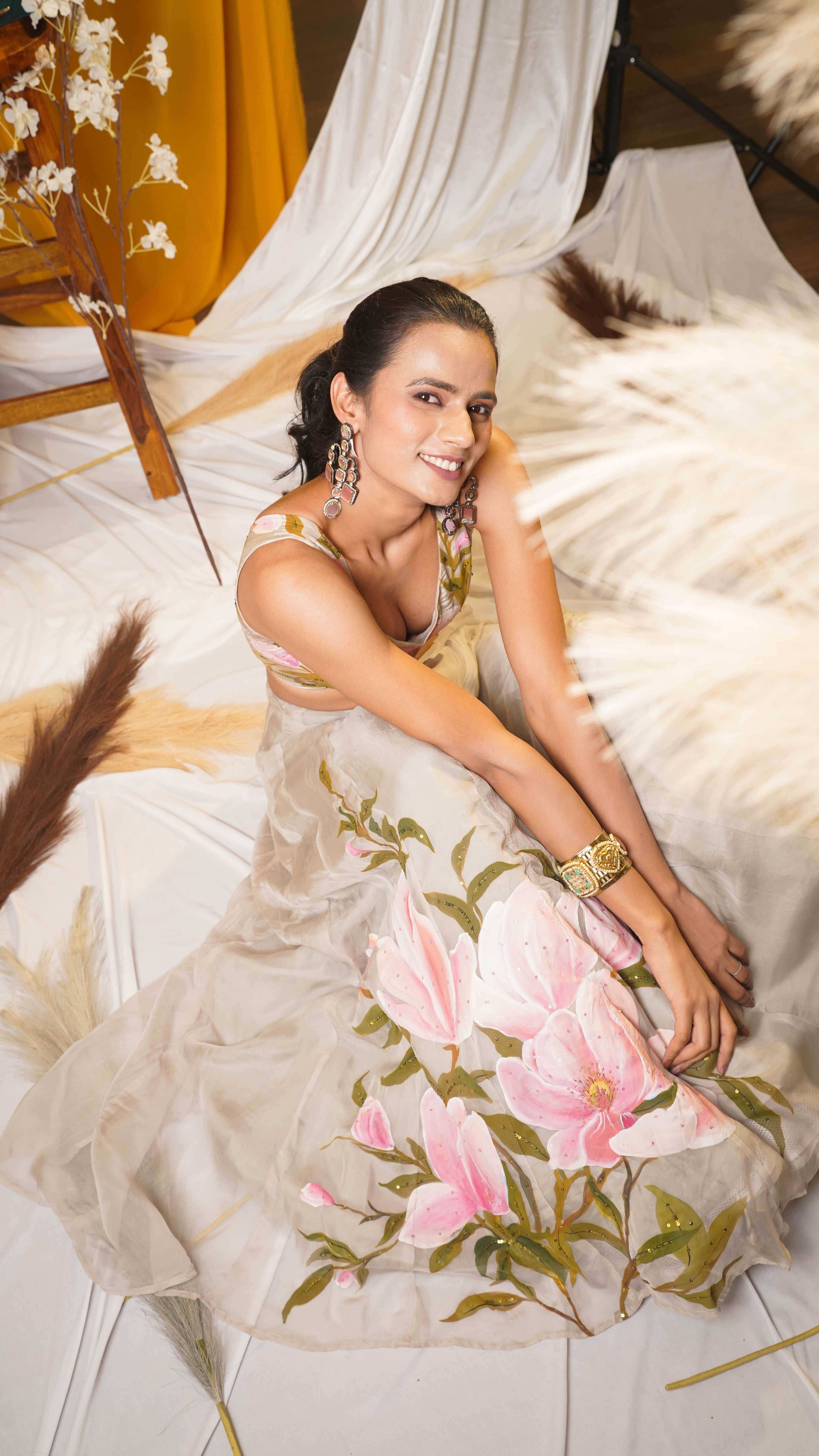 • Design: Hand-painted floral motifs on both blouse and skirt, uniquely crafted by skilled artisans