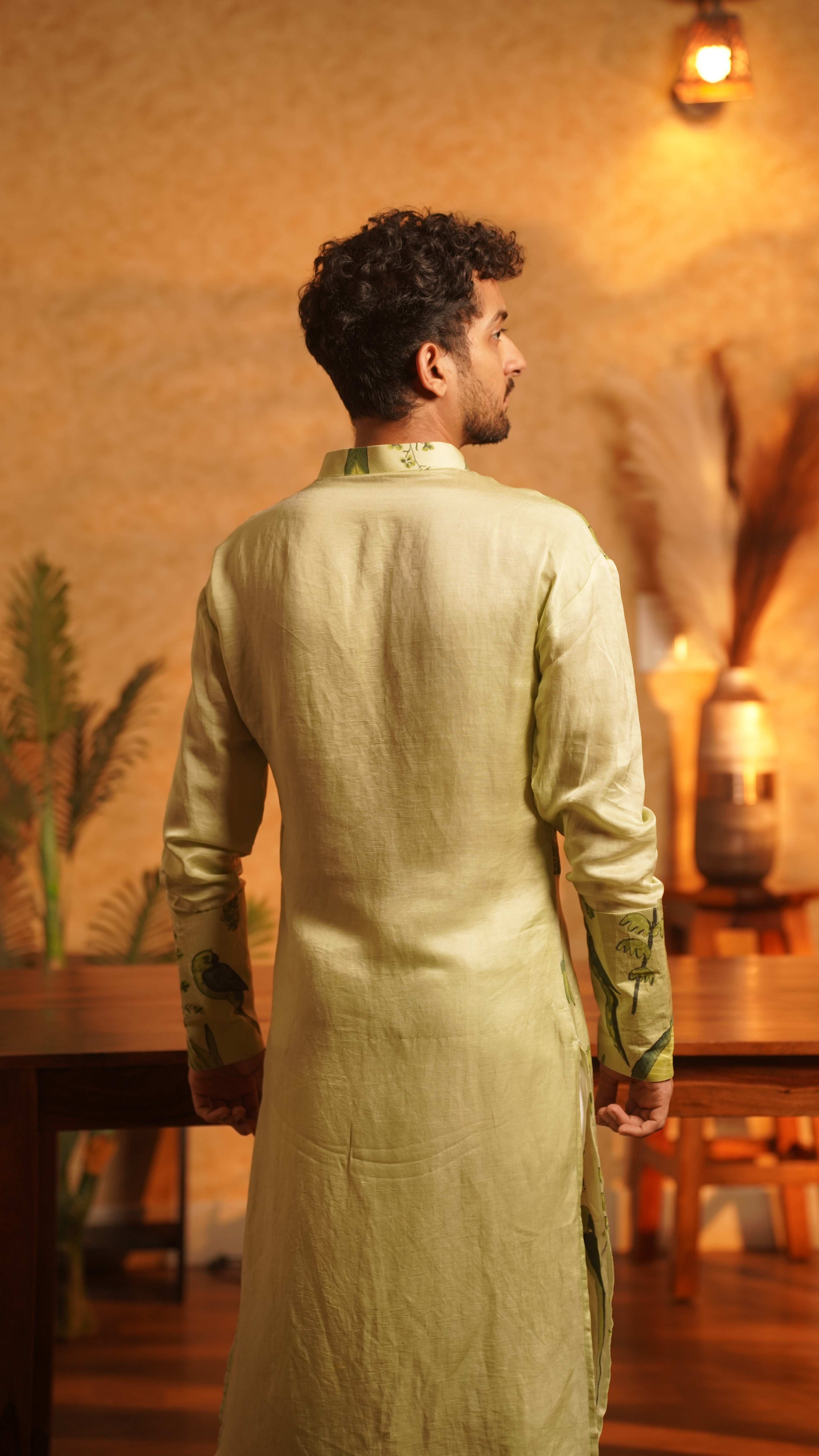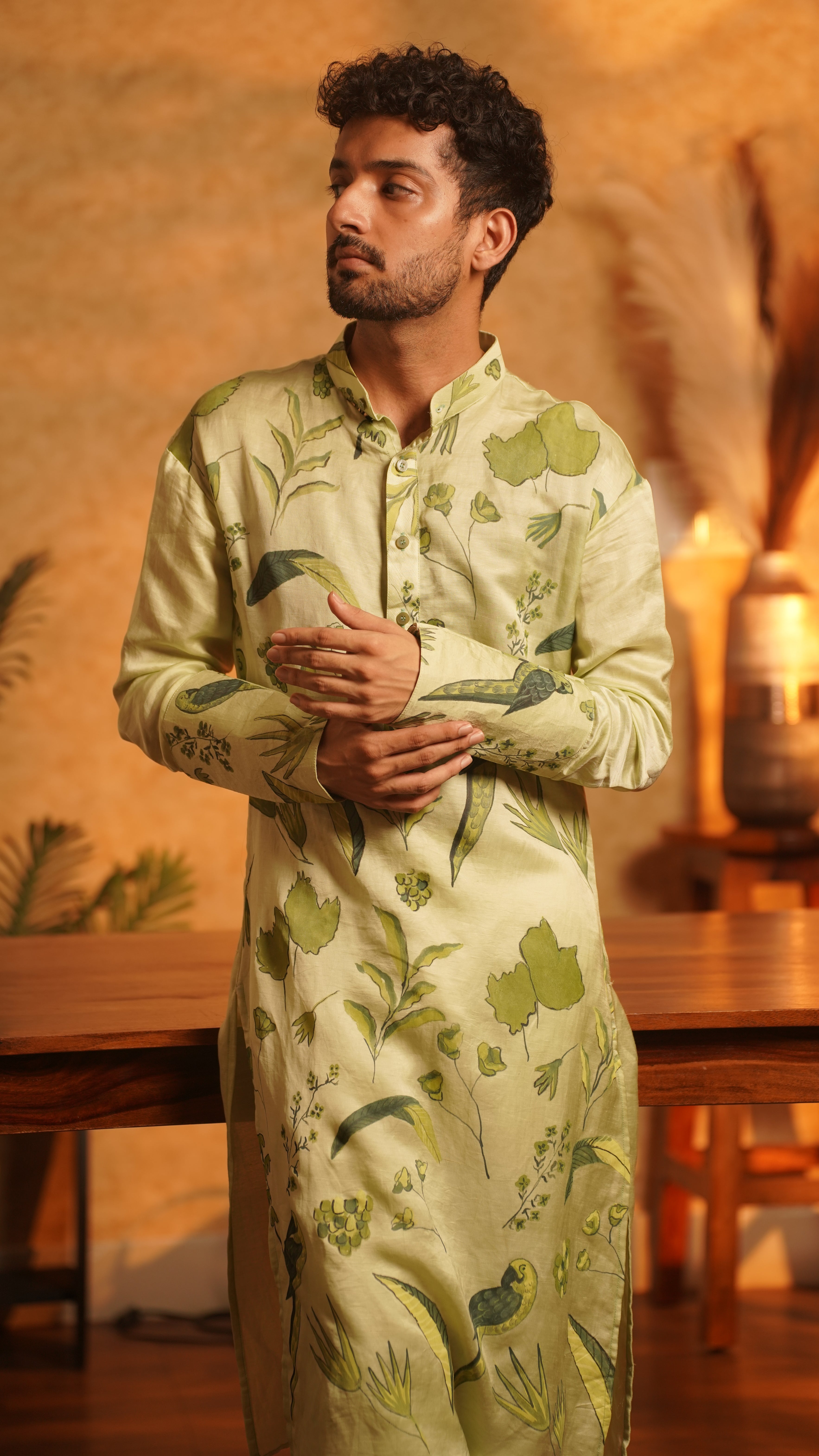 Tropical Twist Men’s Hand-Painted Slub Silk Kurta